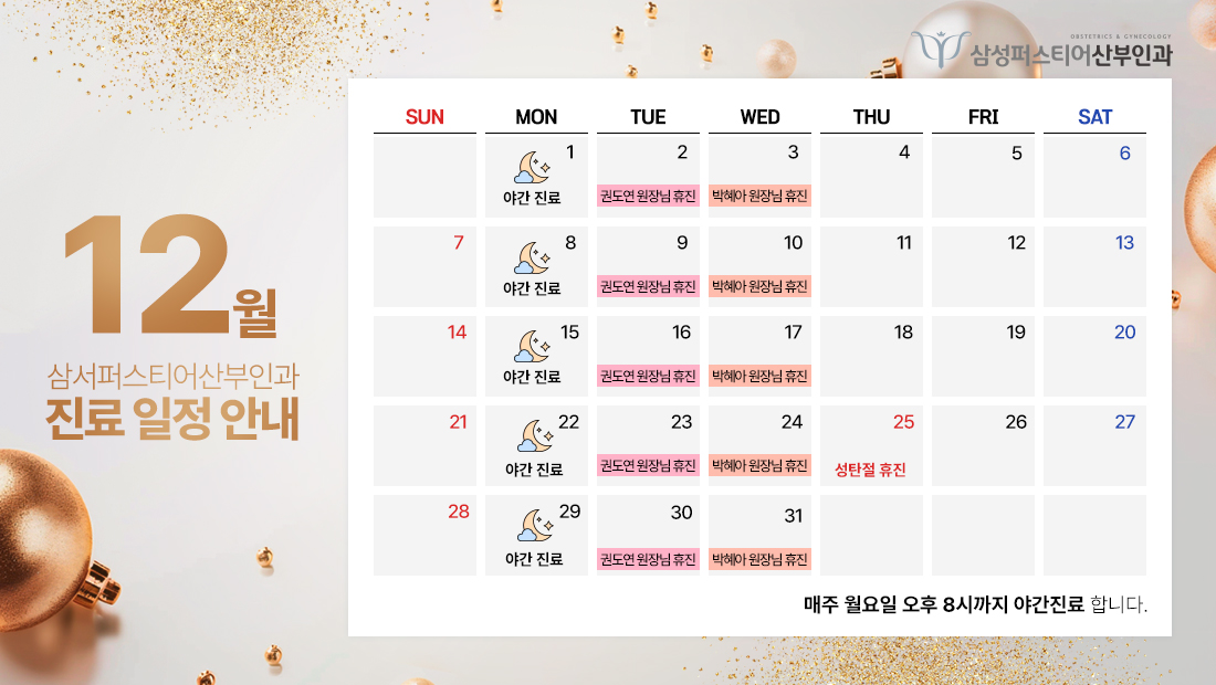 나를 위한 단 하나의 산부인과 삼성퍼스티어 산부인과 여성 생에 전반에 걸친 행복하고 건강한 삶을 위해 삼성퍼스티어 산부인과가 함께하겠습니다. 자세히 알아보기 무엇보다 소중하게 생각하는 마음을 우리는 이해합니다. 풍부한 임상경험과 수년간의 경력을 보유한 산부인과 전문의 대표원장이 안전하게 진료합니다. 자세히 알아보기 쾌적한 환경과 첨단 장비로 편안하고 안전한 진료를 약속합니다. 산과 배란초음파, 산전검사, 태아초음파, 기형아검사, 산후검진 부인과 자궁경부암-HPV, 골반초음파, 질염, 골반염, 방광염, 생리불순, 다낭성난소증후군 예방접종 및 수액 자궁경부암백신, 예방접종, 영양수액 여성건강 클리닉 폐경클리닉, 비만, 산후클리닉, 질레이저 병원 둘러보기 삼성퍼스티어 산부인과의 새로운 소식을 만나보세요. 12월 진료일정 2025. 11. 2711월 진료일정2025. 10. 3010월 진료일정2025. 10. 1310월 연휴 진료안내2025. 09. 119월 진료일정2025. 09. 117월 진료일정2025. 07. 024월 진료 일정2025. 03. 273월 진료 일정2025. 02. 262월 진료 일정2025. 01. 312025년 1월 진료 일정2024. 12. 27 더 많은 소식 보기 위치 및 진료안내 삼성퍼스티어산부인과의원 서울특별시 강남구 선릉로34 8층 삼성퍼스티어산부인과 (1층 스타벅스 건물) 구룡역(수인분당선) 5번 출구 490m(도보7분) 02-6239-5000 진료시간 월요일 : 오전 09:30 - 오후 08:00 (매주 월요일 야간진료) 화 - 금 : 오전 09:30 - 오후 06:30 토요일 : 오전 09:00 - 오후 02:00 (점심시간 없이 진료) 점심시간 : 오후 01:00 - 오후 02:00 휴무 : 일요일 및 공휴일 전화상담하기 네이버예약